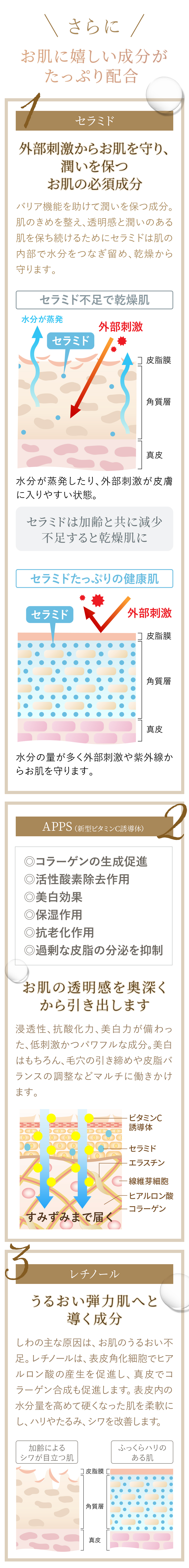 お肌のうるおいやバリア機能をサポートし、紫外線、乾燥、大気汚染物質などの外的ストレスに強いお肌に整えます。