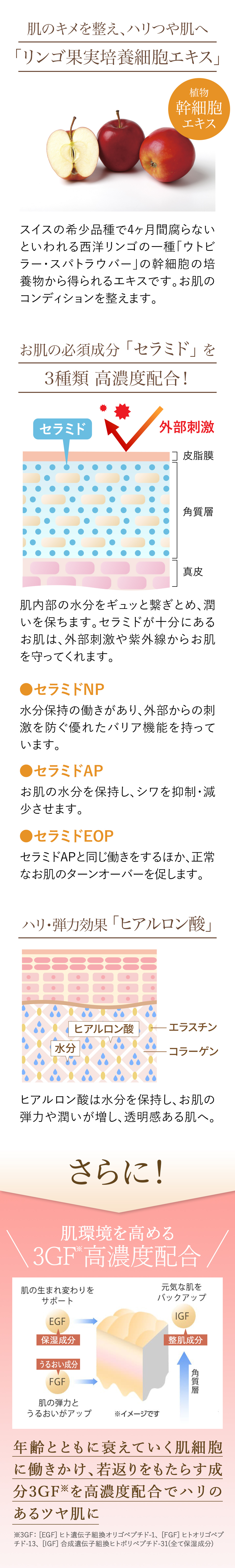 これは「3種類のグロースファクター(EGF・FGF・IGF)」を組み合わせた成分で、総合的にお肌の若々しさをサポートします。