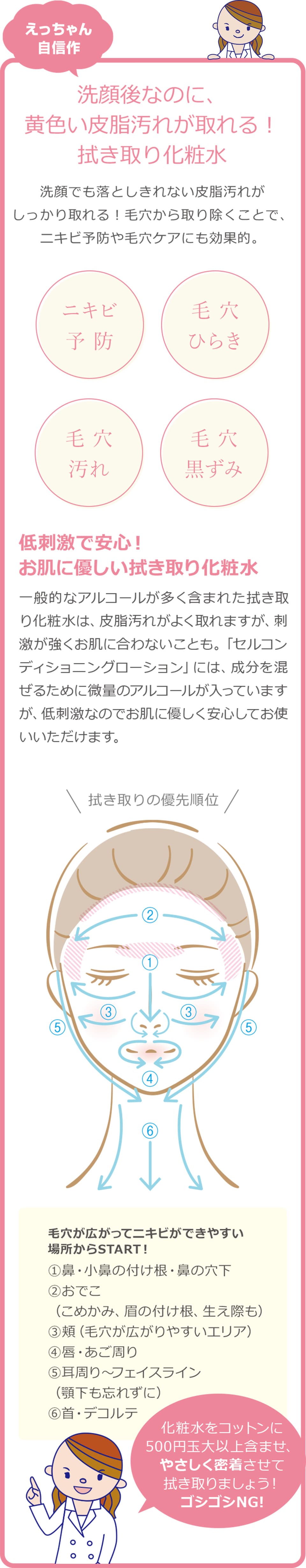 また、化粧水を使用する前に拭き取り用のスキンケアアイテムを使ってみるのも効果的となっています。