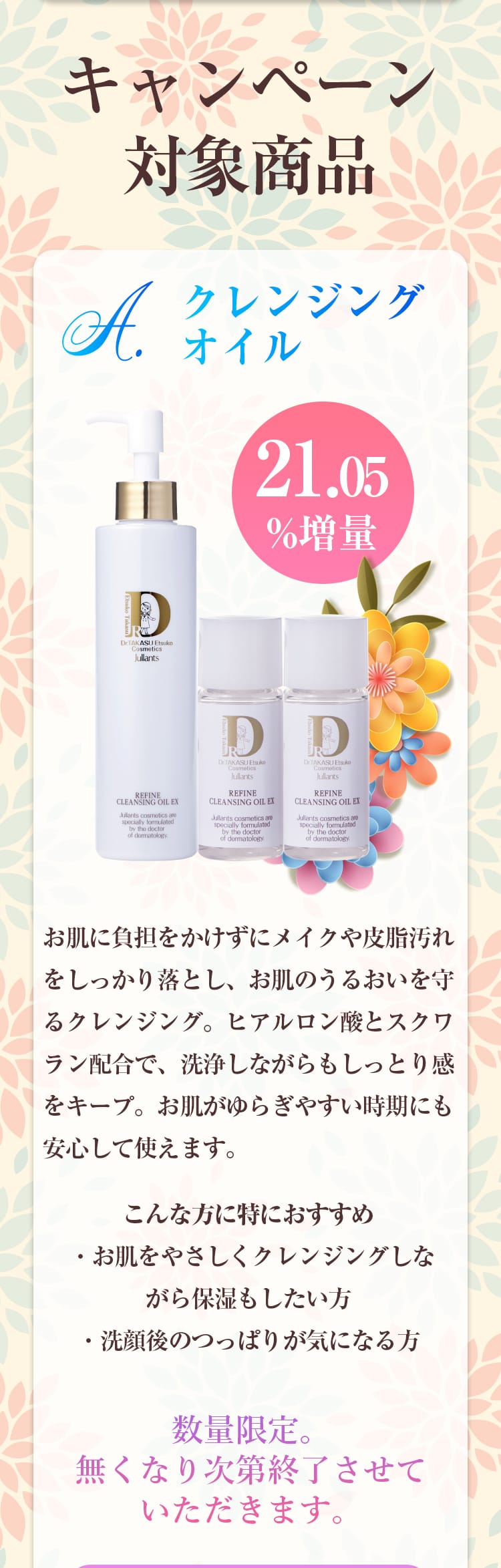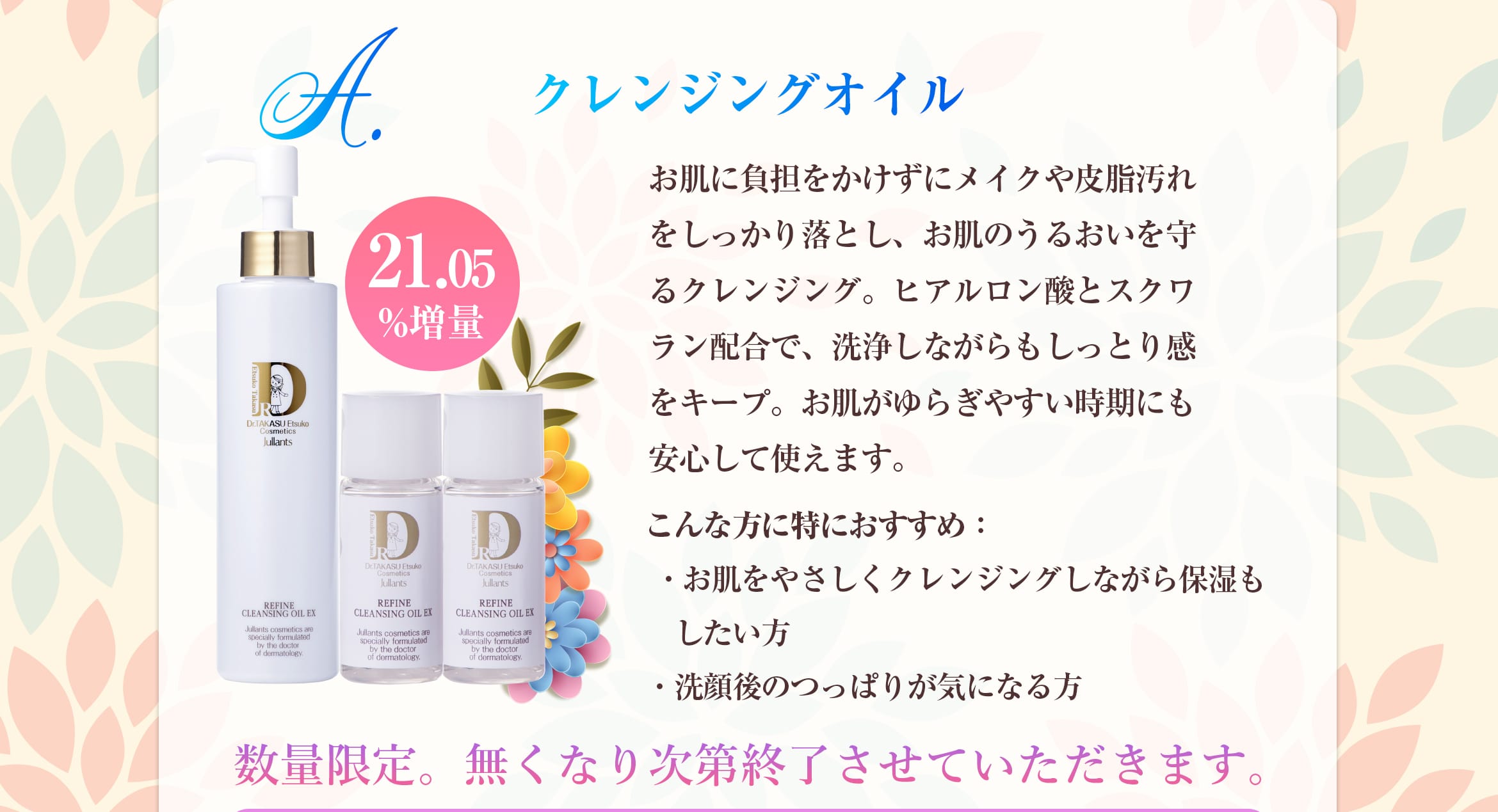 ゆらぎ肌対策として「クレンジングオイル」「クリームクレンジング」「セル コンディショニングローション」「リファイン エマルジョンEX」にそれぞれ増量ミニボトルセットが付いてきます!