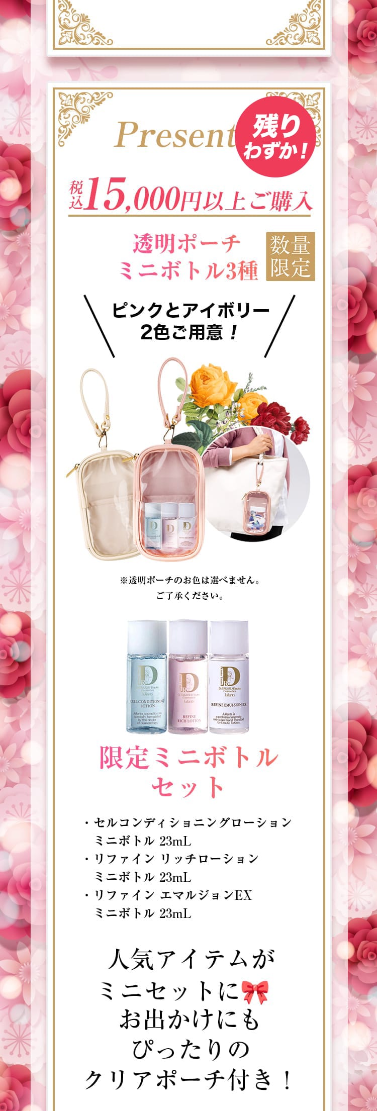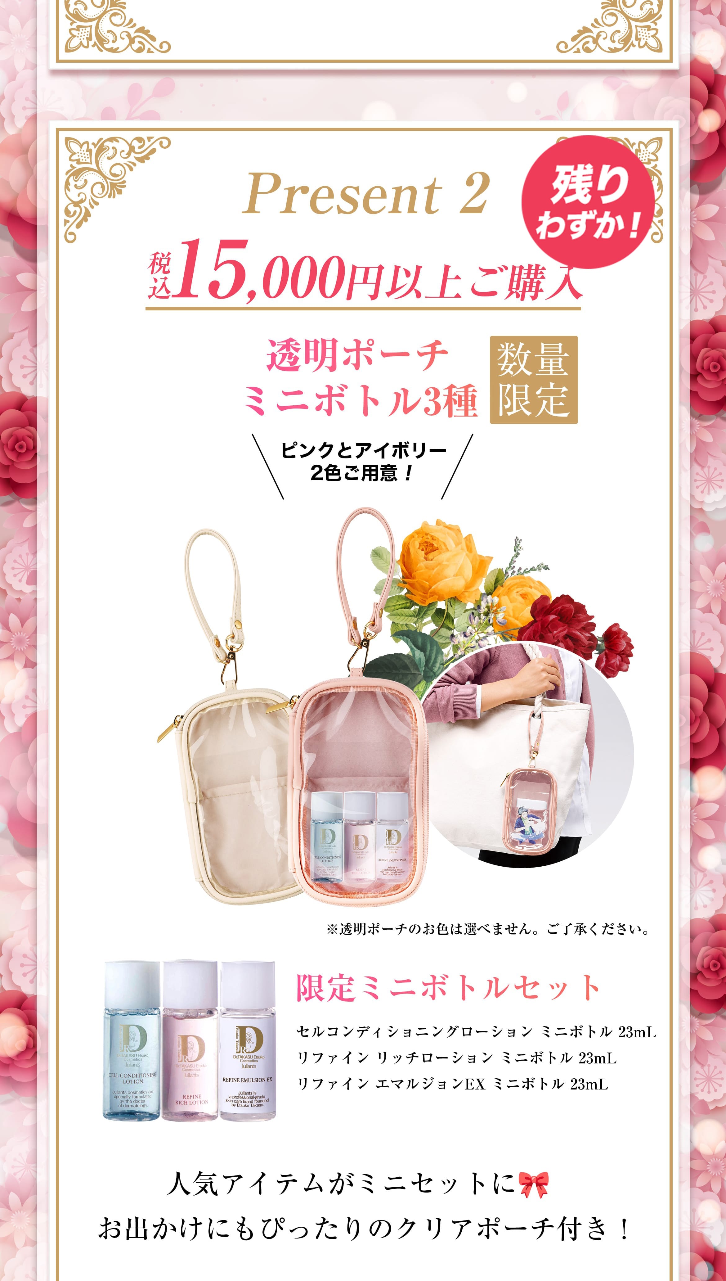 ・税込15,000円以上のお買い物をされると【クリアキャリーポーチ】と【ミニボトルセット 1個】