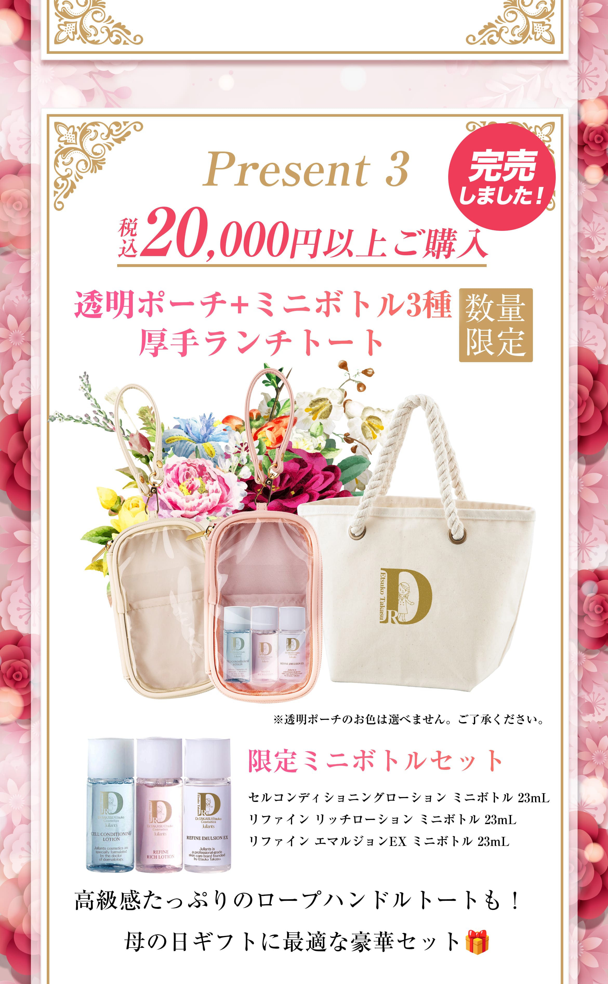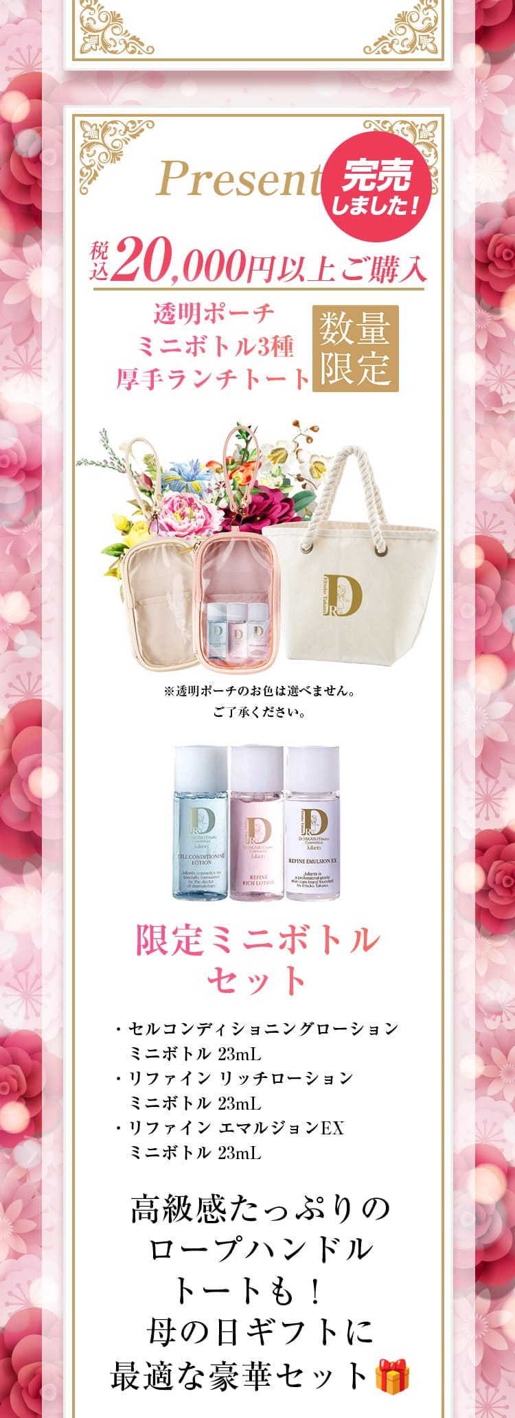 拭き取り+高保湿 そのほんのひと手間がお肌を育てる 母の日限定ミニボトルセット<非売品> 1個 ◯セル コンディショニングローション ミニボトル(23mL) 1個 ◯リファイン リッチローション ミニボトル(23mL) 1個 ◯リファイン エマルジョンEX ミニボトル(23mL) 1個 |
