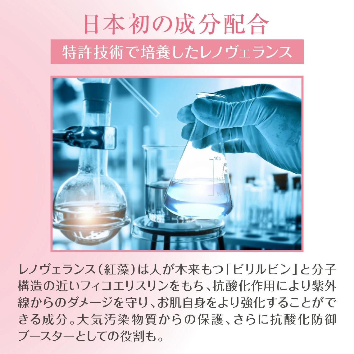 レノヴェランス(紅藻)は⼈が本来もつ「ビリルビン」と分⼦構造の近いフィコエリスリンをもち、抗酸化作用により紫外線からのダメージを守り、お肌⾃⾝をより強化することができる成分。