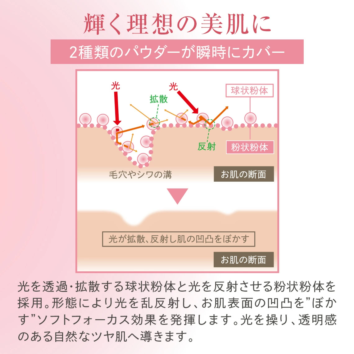 形態により光を乱反射し、お肌表面の凹凸を”ぼかす”ソフトフォーカス効果を発揮します。
