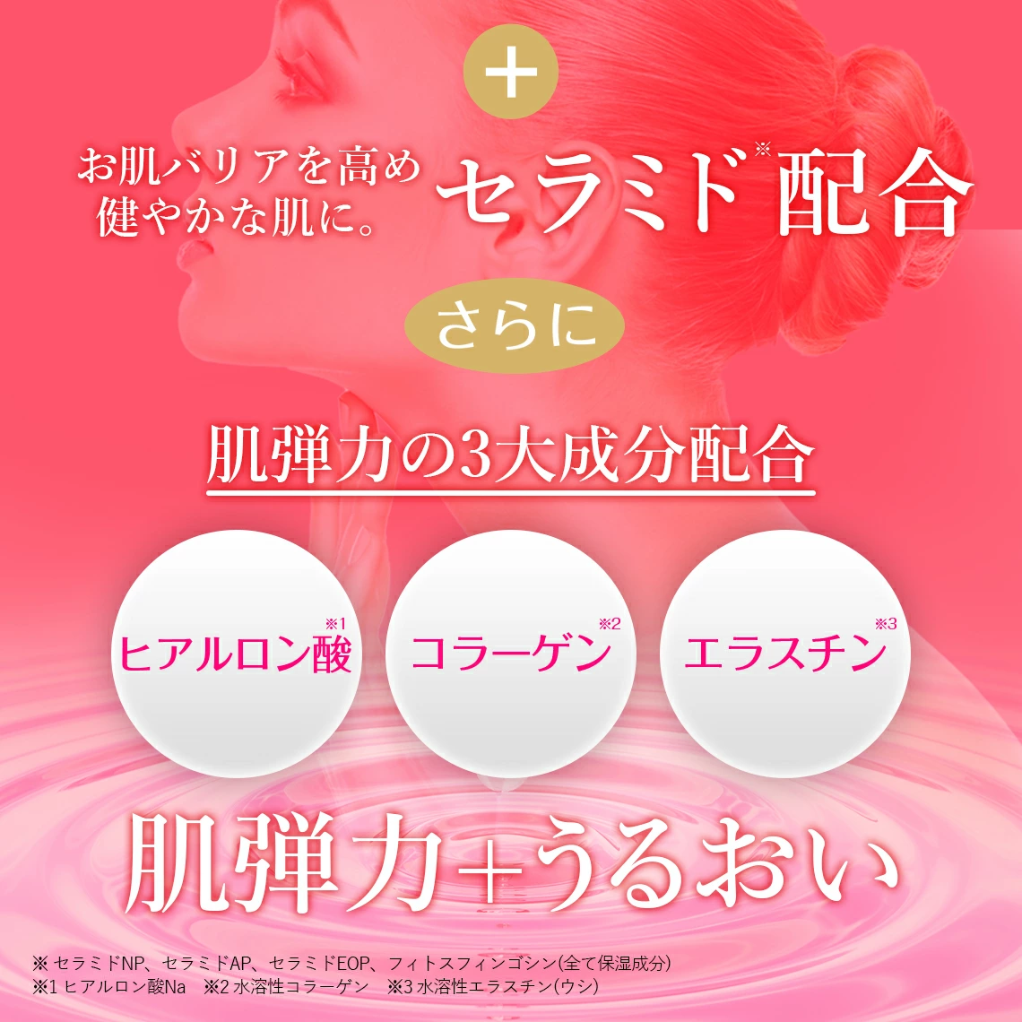 お肌の弾力をつかさどる3大成分(ヒアルロン酸、コラーゲン、エラスチン)に、角質層をうるおいで満たすセラミド*2 をプラス。