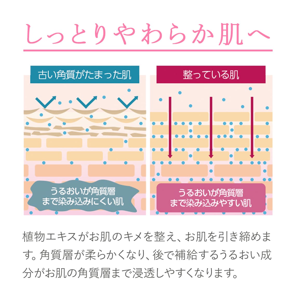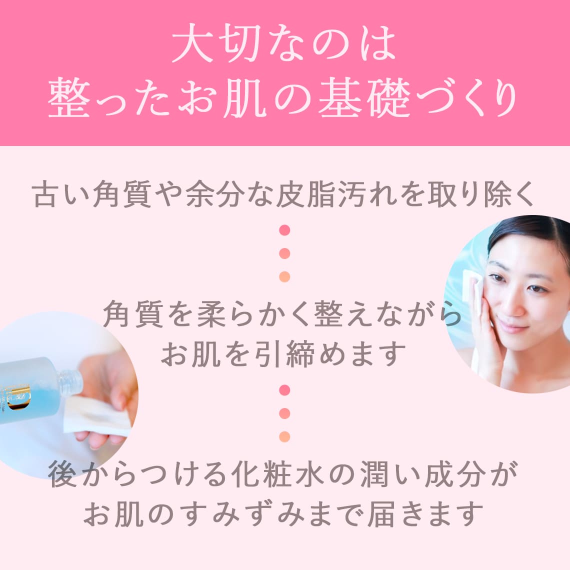 洗顔だけでは落としきれない毛穴の奥に残った汚れや、古くなった角質を優しく取り除き、角質層を柔らかく整えながら毛穴を引き締めます。