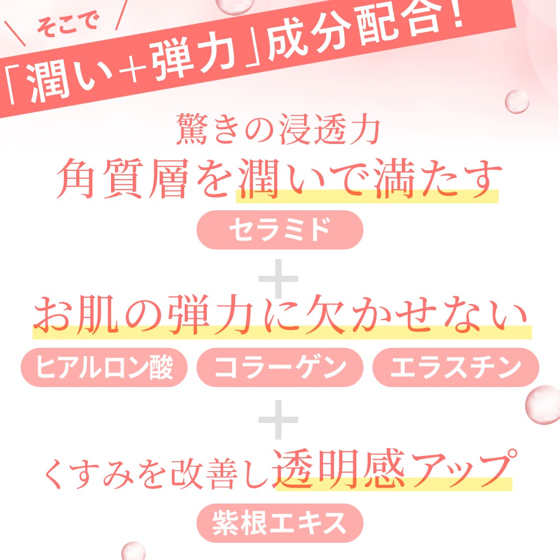 お肌の弾力をつかさどる3大成分(ヒアルロン酸、コラーゲン、エラスチン)に、角質層をうるおいで満たすセラミド*2 をプラス。